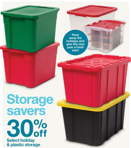 Select Holiday and Plastic Storage 30% off.