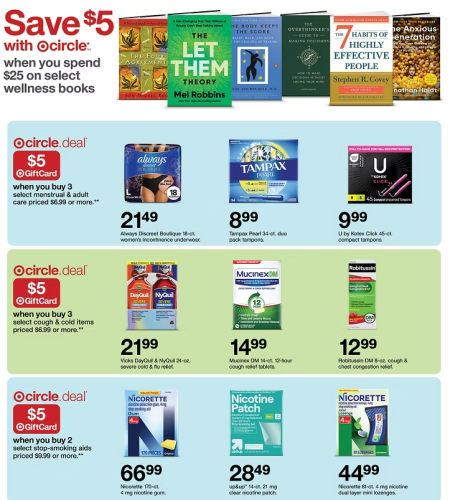 Make sure you’re logged into your Target Circle account to unlock personalized offers. There is a whole page in this week’s ad with $5 Gift Card Deals. There is also a Target Circle deal, which includes a $15 Target Gift Card when you spend $50 on select Household Essentials, or receive a $5 Target Gift Card when you buy 4 select personal or haircare items.